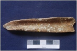 | Description / विवरण | A bone split which has be modified, one end is pointed and the other is wider. It is slightly encrusted. One side is grooved. |