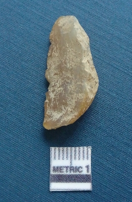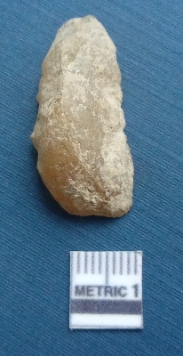 | Description / विवरण | It is a blade fragment with two sharp parallel sides and lateral margin with the working edges. The bulb of percussion is present ventral side with ripple on it due to flaking. It has flake scars on the surface. |