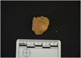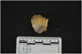 | Description / विवरण | Flake struck on chalcedony, use wear marks visible, cortex present on dorsal side, bulb of percussion visible |