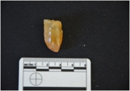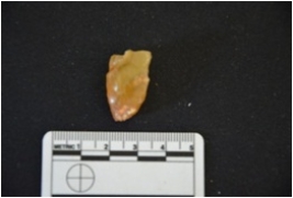 | Description / विवरण | Side struck flake struck on agate, use wear marks seen, bulb of percussion visible |