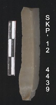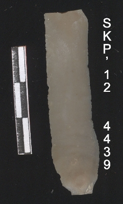 | Description / विवरण | This is a chert blade, with triangular cross section at one broken end. Other end bulb of percussion is seen with a striking platform and shipped off marks. Flaked and retouched. Used ware marks visible on the margins. |