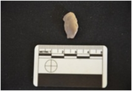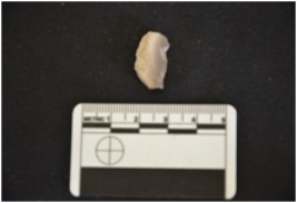 | Description / विवरण | Chert utilized flake has flake scars on dorsal side, striking platform, bulb on ventral side and use wear marks on working edge. |