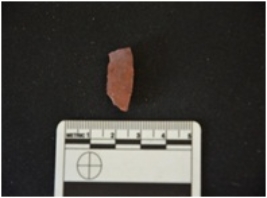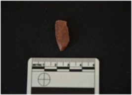 | Description / विवरण | Backed blade made of chert, broken at both ends, use wear marks on the cutting edge |