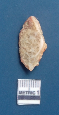 | Description / विवरण | It is a blade fragment with two sharp parallel sides and lateral margin with the working edges. The bulb of percussion is present ventral side with ripple on it due to flaking. It has flake scars on the surface. |