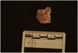 | Description / विवरण | Chert utilized flake has midridge on dorsal side, striking platform, bulb on ventral side, broken from distal end, triangular cross-section and use wear marks on working edge. |