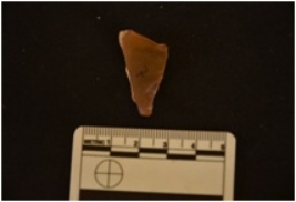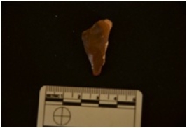 | Description / विवरण | Chert utilized flake has ridges and flake scars on dorsal side staking platform, diffused bulb on ventral side and use wear marks on working edge. |