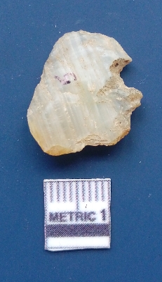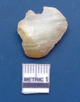 | Description / विवरण | It is a flake. The flake scars are clearly seen on the dorsal surface and the ventral surface is plain. The sides are sharp. The soil incrustations and the bands are clearly seen. |