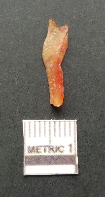 | Description / विवरण | It is a blade fragment. The ridges are clearly seen on the dorsal surface while the ventral surface is plain. It is reddish in colour. |