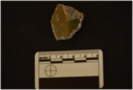 | Description / विवरण | A chert utilized flake has striking platform negative bulb on ventral side and use wear marks on working edge. |