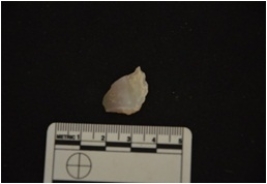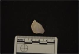 | Description / विवरण | flake made on quartz, use marks seen on both edges, flake struck on prepared platform, bulb of percussion visible |