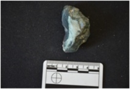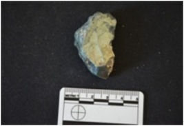 | Description / विवरण | A blood stone utilized flake has flake scars, striking platform and use wear marks on working edge. |