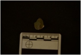 | Description / विवरण | Moss agate utilized flake has flake scars on dorsal side. Striking platform bulb ob ventral side and use wear marks on working edge. |