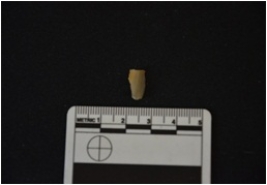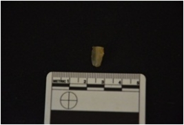 | Description / विवरण | Fragment of a blade made on chert, bulb of percussion visible, broken at the distal end, use wear marks seen on both edges |