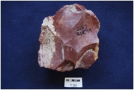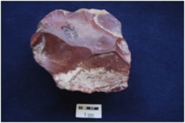 | Description / विवरण | Scraper made on chert, prepared platform with diffused bulb. Retouches along the cutting surface. |