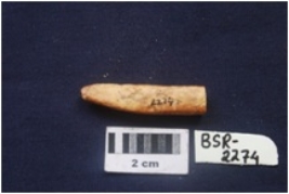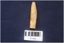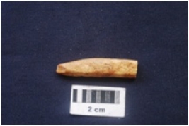 | Description / विवरण | Fragment of a bone point has rectangular cross section, smooth surface and tip showing scoope mark. |