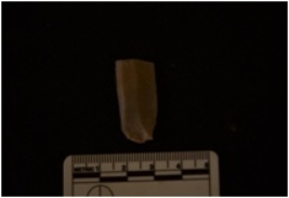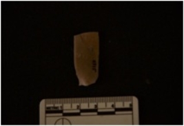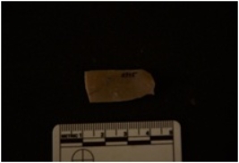 | Description / विवरण | Fragment of chert blade has two ridges on dorsal side, striking platform, bulb on ventral side, broken from distal end, use-wear marks on cutting edges and trapezoidal cross-section. |