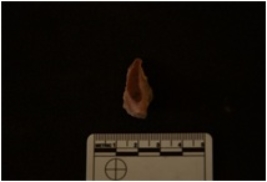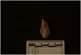 | Description / विवरण | Chert utilized flake has flake scars with partly visible cortex on dorsal side, striking platform, bulb on ventral side and use wear marks on working edge. |