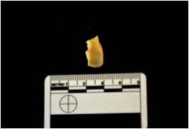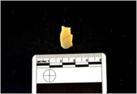 | Description / विवरण | Fragment of a blade made on chert, use wear marks visible, bulb of percussion visible, broken at the distal end |