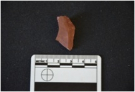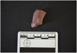 | Description / विवरण | Chert utilized flake has a midridge on dorsal side, striking platform, negative bulb on ventral side and use wear marks on working edges. |
