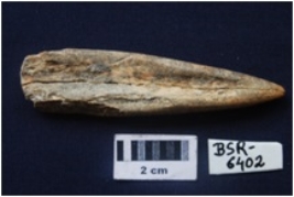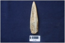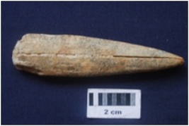 | Description / विवरण | A flattish bone point, broad at one end and pointed at another. Was broken into two pieces which vertically are joined with glue. |