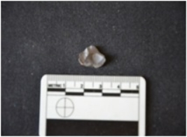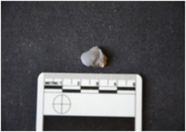 | Description / विवरण | A chert utilized flake has flake scars on dorsal side, striking platform, diffused bulb with errailure on ventral side and use-wear marks on working edge. |
