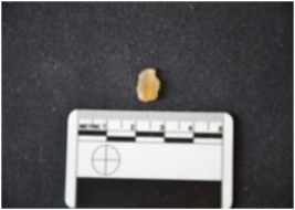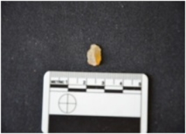 | Description / विवरण | Chalcedony blade fragment has a midridge on dorsal side, striking platform, bulb on ventral side, broken from distal end, triangular cross-section and use-wear marks on cutting edges. |