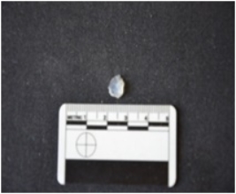 | Description / विवरण | Fragment of chalcedony blade has ridges and flake scars on dorsal side, striking platform, partly broken and use-wear marks on cutting edges. |