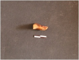 | Description / विवरण | Chalcedony blade fragment having two ridges on surface, striking platform, diffused bulb on ventral side, broken form distal end, trapezoidal cross-section and use-wear marks on edges. |
