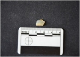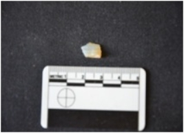 | Description / विवरण | Fragment of chalcedony blade has striking platform, diffused bulb on ventral side, broken from distal end and use-wear marks on cutting edges. |