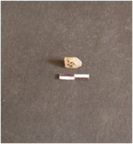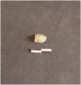 | Description / विवरण | Chalcedony blade fragment has a crested ridge on dorsal side, striking platform, bulb on ventral side broken from distal end, triangular cross-section use-wear marks and retouches on edges. |