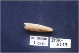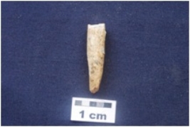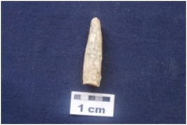 | Description / विवरण | Fragment of a point, partly broken along at pointed end, broken on other end, circular cross-section and 2 circular cut marks on surface. |