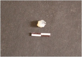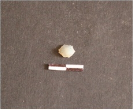 | Description / विवरण | Chalcedony flake has flake scars on dorsal side, striking platform, bulb on ventral side, retouches and use-wear marks on edges. |