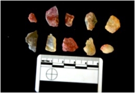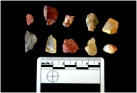 | Description / विवरण | Flakes struck on chert, use wear marks seen on all of them, bulb of percussion visible in a few |