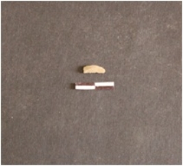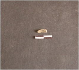 | Description / विवरण | Chert lunate fragment has a ridge on dorsal side, striking platform, broken at one end, backing along at one edge and use-wear marks on other edge. |