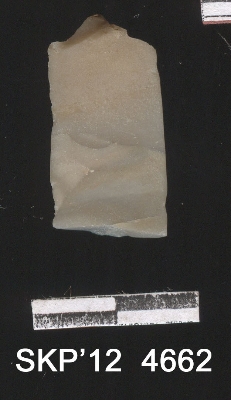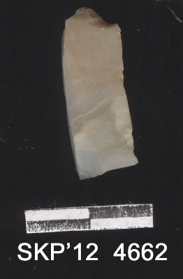 | Description / विवरण | This is chert blade fragment with one end broken with trapezium cross section. Flaked ridges on the dorsal side and the other end are of arrow head shape with retouched denticulate marks. |