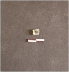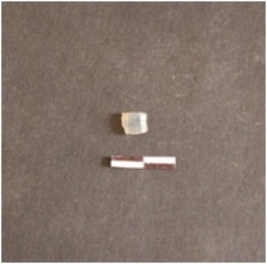 | Description / विवरण | Chalcedony blade fragment has two ridges on dorsal side, broken from both ends, trapezoidal cross-section and use-wear marks on edges. |