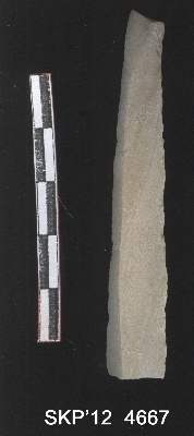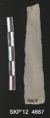 | Description / विवरण | This is a long chert blade tapered at one end and flattened with triangular cross section on either end. Both sides are flaked to form a lined rib at margins with use wall marks. |