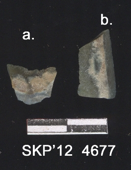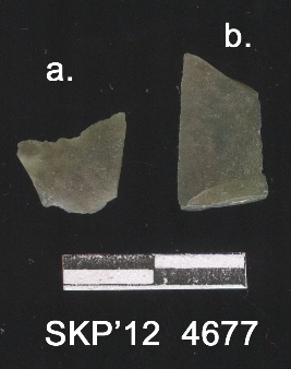 | Description / विवरण | Agate blade fragment with flaked surface, use ware marks, and sharp margins. Green in color with three round yellowish patches due to natural reason. |