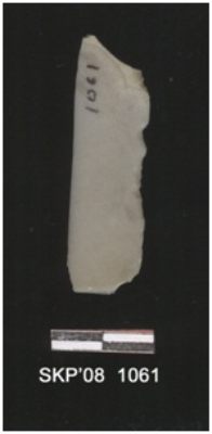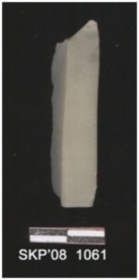| Description / विवरण | Broken chert blade. It is triangular in cross section. The retouch can be seen on one side. The ventral side is plain. |