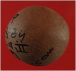 | Description / विवरण | Trench XAS 19, Qdt 2, layer 8, depth 355 cm It is a ball made of terracotta. Shape is well round and surface is very smooth; colour is brick brown. |