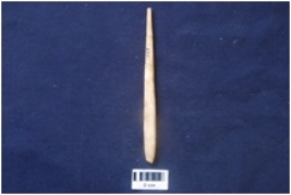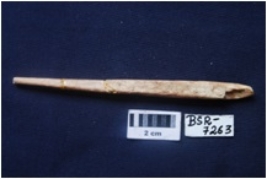 | Description / विवरण | A bone point with roughly rectangular section. One end is pointed. Circular design near the base. Broken into three pieces. |