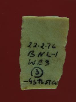 | Description / विवरण | Trench WB 3, layer 3, depth 43 to 57 cms It s a chert blade in rectangular shape. Edges are sharp and little bit thick from the middle. Surface is smooth. |