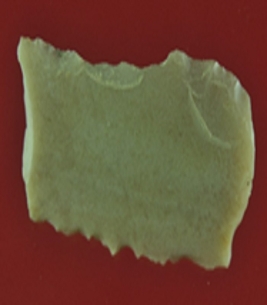 | Description / विवरण | It s a chert blade in rectangular shape. Little bit thick in the middle and edges are rough. Surface is smooth and appearance is off white. |