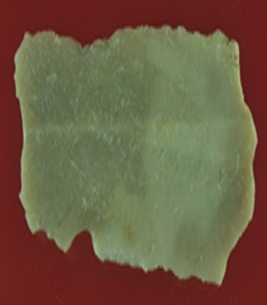 | Description / विवरण | It s a chert blade in rectangular shape but one side is broder than other. Little bit thick in the middle and edges are rough. Surface is smooth and appearance is off white. |