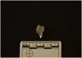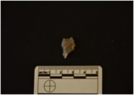 | Description / विवरण | Chalcedony blade fragment has flake scars on dorsal side, broken from both ends and use-wear marks on edges. |