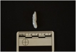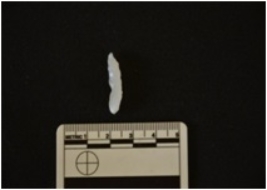 | Description / विवरण | Chalcedony backed blade has crested ridge on dorsal side striking platform backing along at one edge and retouches on other edge. |