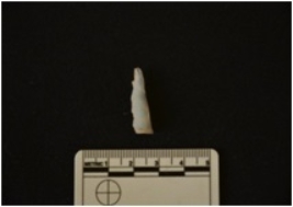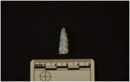 | Description / विवरण | Chalcedony blade fragment has a crested ridge on dorsal side striking platform and use wear marks on edges. |