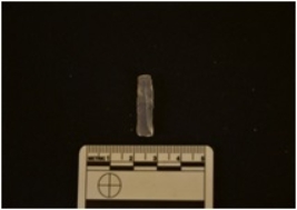 | Description / विवरण | Chalcedony blade has two ridges on dorsal side, striking platform, diffused bulb on ventral side and use-wear marks on edges. |