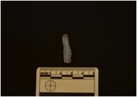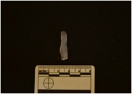 | Description / विवरण | Chalcedony blade has a ridge on dorsal side, striking platform and retouches on edges. |
