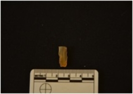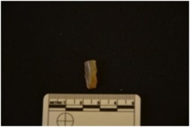 | Description / विवरण | Agate blade fragment has two ridges on dorsal side, striking platform,diffused bulb on ventral side,broken from distal end, retouches on edges and heated. |